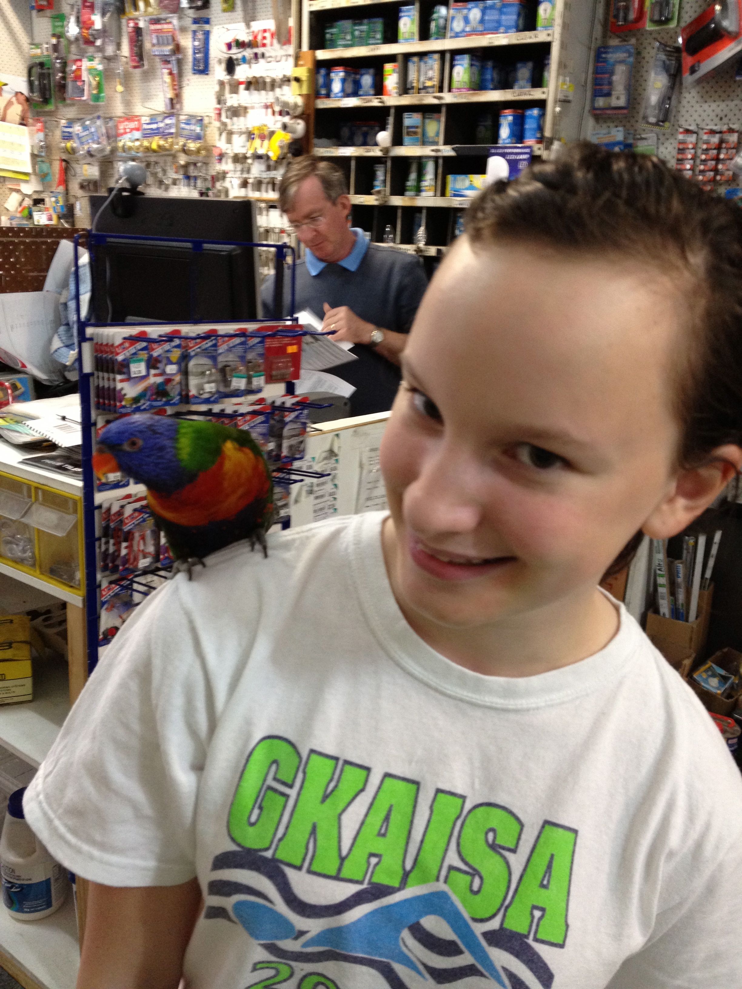 What a beauty she was! She really liked MBD’s pony tail holder and promptly bit me when I tried to remove her. She eventually moved to my shoulders but was more interested in my Vera Bradley roller bag. (Before any of you snicker, remember we were headed to an internet cafe. The roller bag was needed.) She (yes, I DO know it was a she because the owner called her one as in, Me:”It’s really going for my colorful bag.” Owner: “Yes, SHE is.” So there) nibbled every surface of the VB and before she could take a dump, I moved her back to her cage. Off we go.