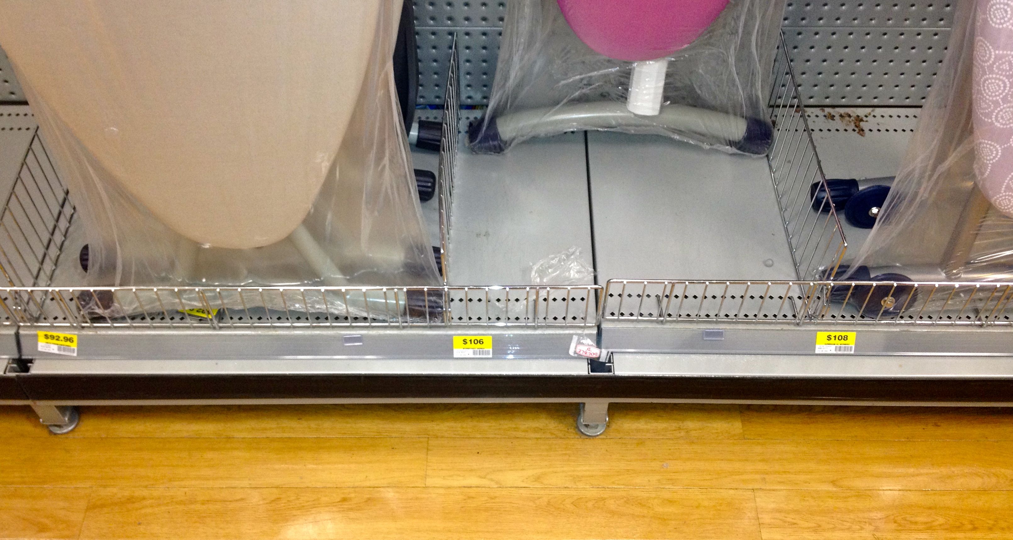 No, you do not need glasses. Or at least I hope you don’t and can make out the prices in the picture: $92.96, $106 and $108. There is not a single thing different in these boards than those at your local WalMart. Oh and if you’re trying to be smart, the iron is NOT included! Ironically the boards in the picture were available from the Big W here in Manly which is the equivalent of the US Walmart. Go figure….
