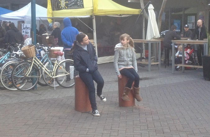 After a few hours of archery, what more fun can you have than hanging out on the pedestrian mall in downtown Manly? This is MBD and her good friend Lily chatting about things. The picture is grainy due to the iPhone camera, not due to weather. But it kind of looks like a foggy day and a bit romantic so I thought I’d keep it rather than discard it. Surf was high today (see the header picture posted above on 22-June) and even though it’s cold outside there were lots of people in wet suits enjoying the waves. The four of us enjoyed fish and chips (indoors, not outside today!) We are getting over our colds and feeling better after a rough week back!