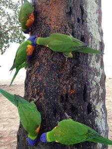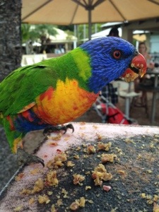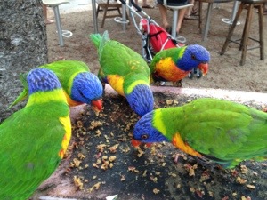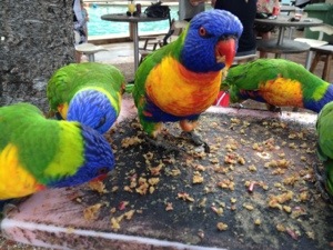 A Feeding Frenzy! December 24, 2012 / Susan Everyday at 4:45PM, the resort feeds the Rainbow Lorikeets and it is definitely a feeding frenzy! And one forgot his table manners and one is telling me, “Don’t eyeball me girl!” Share this:Share Click to print (Opens in new window) Print Click to email a link to a friend (Opens in new window) Email Click to share on X (Opens in new window) X Click to share on Facebook (Opens in new window) Facebook Click to share on Pinterest (Opens in new window) Pinterest Click to share on LinkedIn (Opens in new window) LinkedIn Click to share on Reddit (Opens in new window) Reddit Click to share on Tumblr (Opens in new window) Tumblr Like Loading... Related
