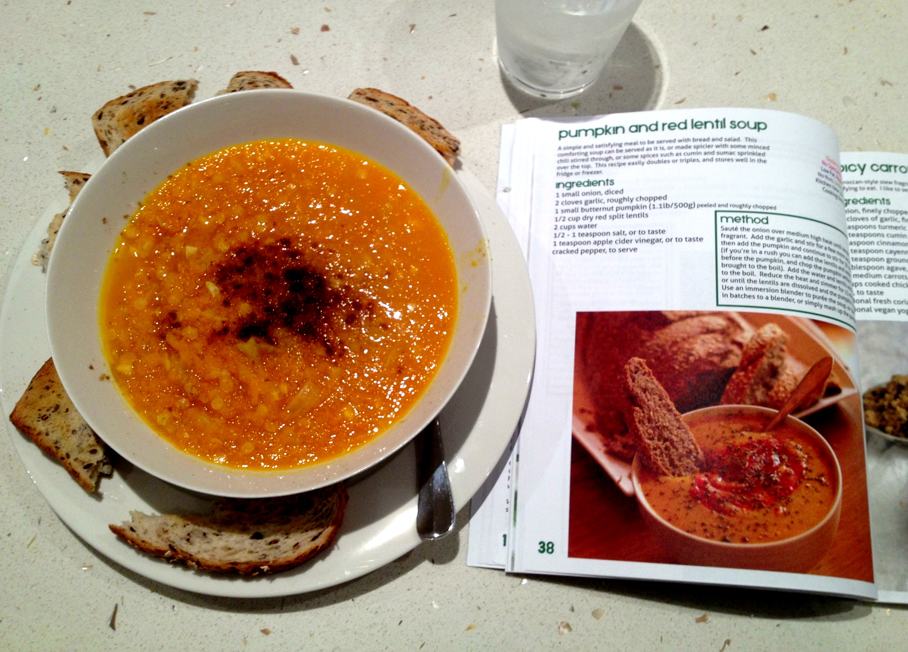 My First Attempt at Vegan Cooking March 1, 2013March 1, 2013 / messpot Got pretty close to the recipe. Next time I’ll use the food processor longer and actually puree the ingredients. To me, pumpkin soup ought to be thin with minimal texture. Of course, MBD wanted nothing to do with this recipe! Share this:Share Click to print (Opens in new window) Print Click to email a link to a friend (Opens in new window) Email Click to share on X (Opens in new window) X Click to share on Facebook (Opens in new window) Facebook Click to share on Pinterest (Opens in new window) Pinterest Click to share on LinkedIn (Opens in new window) LinkedIn Click to share on Reddit (Opens in new window) Reddit Click to share on Tumblr (Opens in new window) Tumblr Like Loading... Related