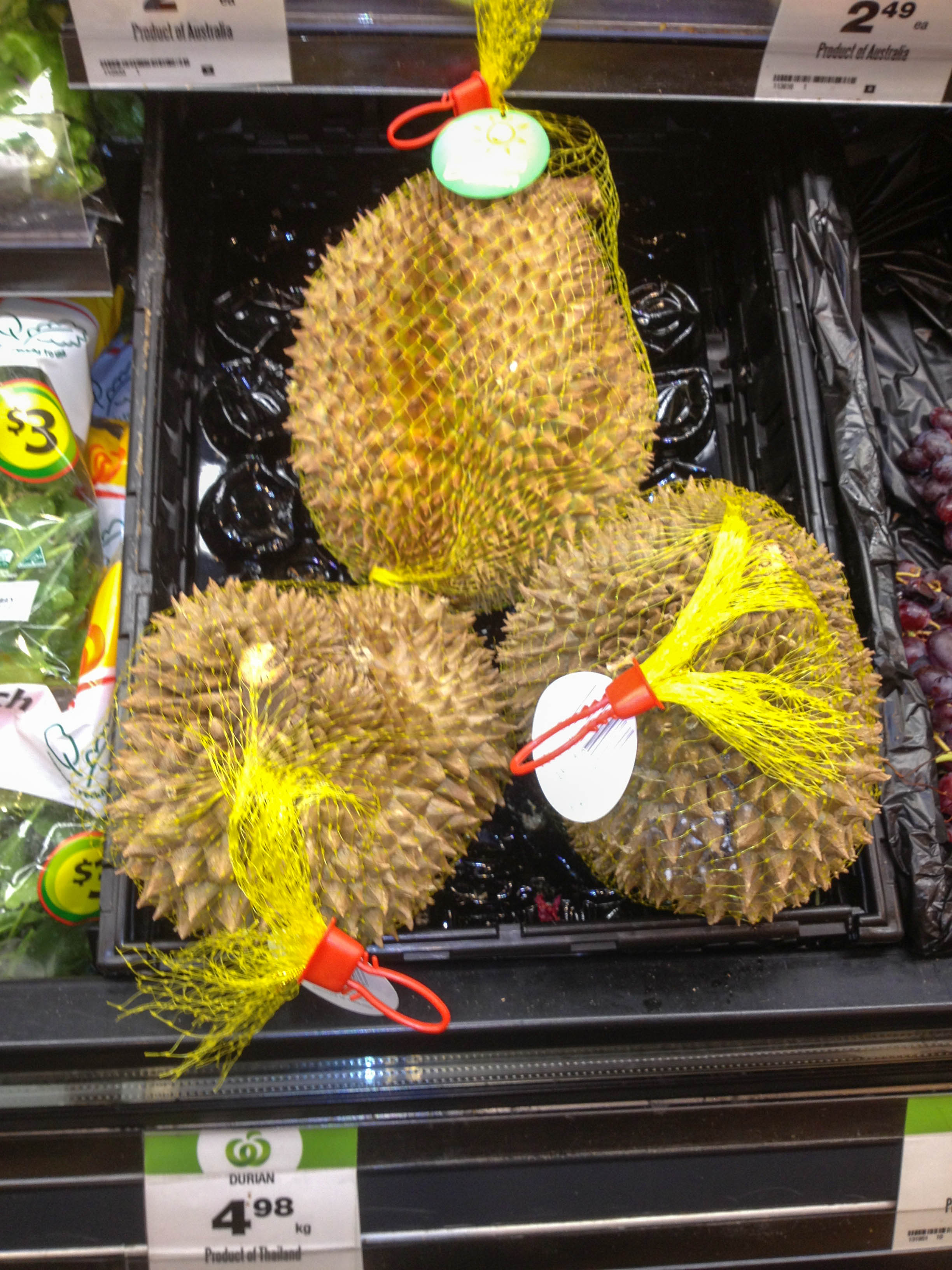 Odd name for a fruit, isn’t it? Everyone nowadays is calling things “super fruits” or “super foods.” They say the same thing about this strange looking fruit that is grown up in Thailand. Available in many asian neighbourhoods around Sydney, I saw this in Burwood to the west of Sydney where I’ve been working. You don’t want to try it. You don’t even want to SMELL it. The fruit has a sulphur taste to it that, after having just a little taste of it last year, took me HOURS to get the taste of rotten eggs out of my taste buds! MBW and I learned that the cab drivers up in Phuket won’t let passengers eat this fruit in their cabs because they can’t get the smell out after they leave. Lovely to look at, fun to touch, but cut it open and you’ll say “TOO MUCH!” 🙂